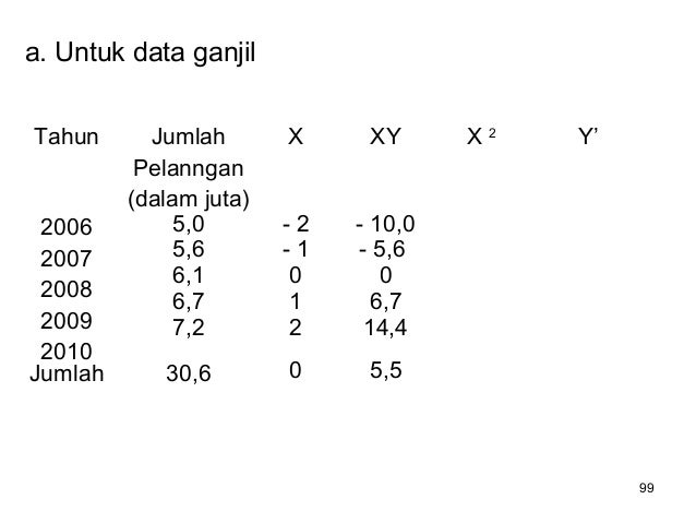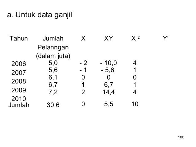 - 100. 100 a. Untuk data ganjil Tahun Jumlah Pelanngan (dalam juta) X XY X 2 Y’ 2006 2007 2008 2009 2010 5,0 5,6 6,1 6,7 7,2 - 2 - 1 0 1 2 - 10,0 - 5,6 0 6,7 14,4 4 1 0 1 4 Jumlah 30,6 0 5,5 10