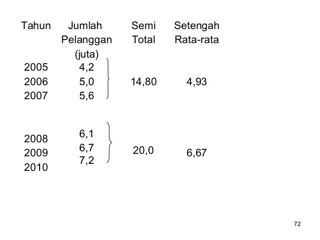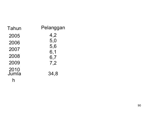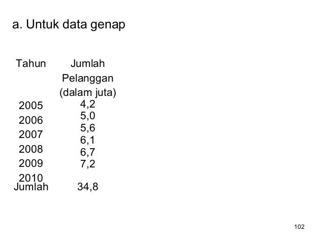 - 102. 102 a. Untuk data genap Tahun Jumlah Pelanggan (dalam juta) 2005 2006 2007 2008 2009 2010 4,2 5,0 5,6 6,1 6,7 7,2 Jumlah 34,8