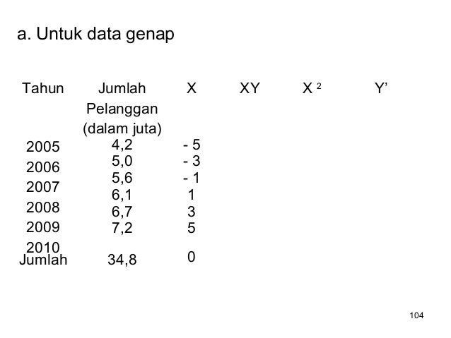 - 104. 104 a. Untuk data genap Tahun Jumlah Pelanggan (dalam juta) X XY X 2 Y’ 2005 2006 2007 2008 2009 2010 4,2 5,0 5,6 6,1 6,7 7,2 - 5 - 3 - 1 1 3 5 Jumlah 34,8 0
