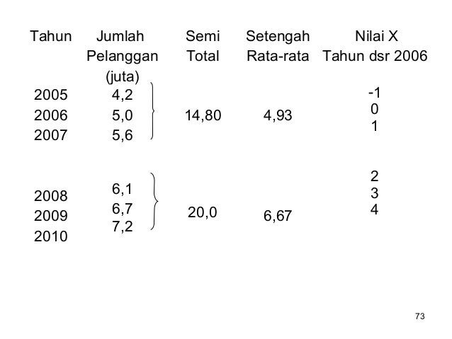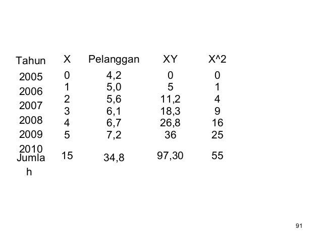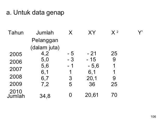 - 106. 106 a. Untuk data genap Tahun Jumlah Pelanggan (dalam juta) X XY X 2 Y’ 2005 2006 2007 2008 2009 2010 4,2 5,0 5,6 6,1 6,7 7,2 - 5 - 3 - 1 1 3 5 - 21 - 15 - 5,6 6,1 20,1 36 25 9 1 1 9 25 Jumlah 34,8 0 20,61 70