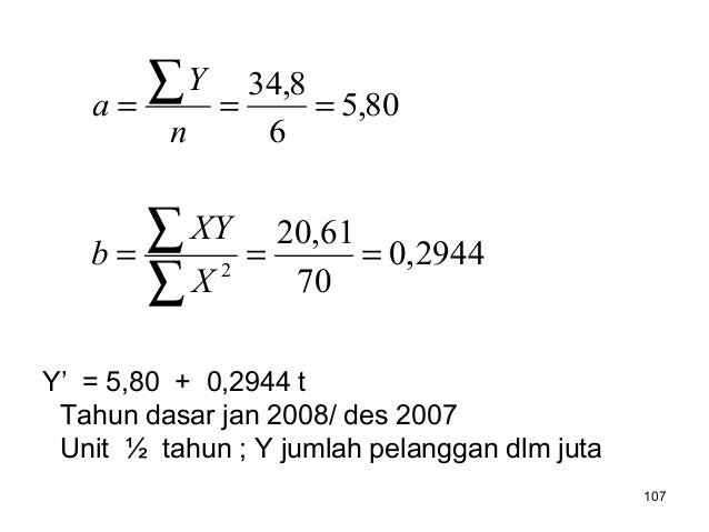 - 107. 107 80,5 6 8,34 === ∑ n Y a 2944,0 70 61,20 2 === ∑ ∑ X XY b Y’ = 5,80 + 0,2944 t Tahun dasar jan 2008/ des 2007 Unit ½ tahun ; Y jumlah pelanggan dlm juta