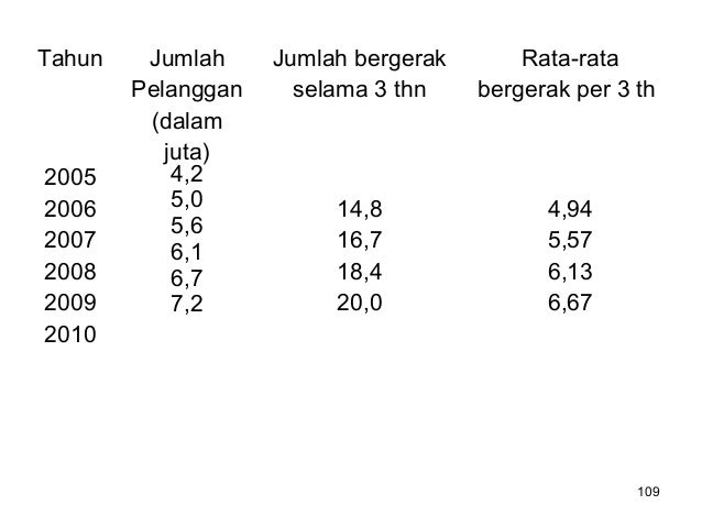 - 109. 109 Tahun Jumlah Pelanggan (dalam juta) Jumlah bergerak selama 3 thn Rata-rata bergerak per 3 th 2005 2006 2007 2008 2009 2010 4,2 5,0 5,6 6,1 6,7 7,2 14,8 16,7 18,4 20,0 4,94 5,57 6,13 6,67