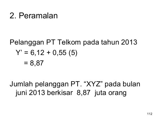 - 112. 112 2. Peramalan Pelanggan PT Telkom pada tahun 2013 Y’ = 6,12 + 0,55 (5) = 8,87 Jumlah pelanggan PT. “XYZ” pada bulan juni 2013 berkisar 8,87 juta orang