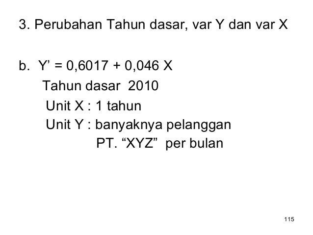 - 115. 115 3. Perubahan Tahun dasar, var Y dan var X b. Y’ = 0,6017 + 0,046 X Tahun dasar 2010 Unit X : 1 tahun Unit Y : banyaknya pelanggan PT. “XYZ” per bulan