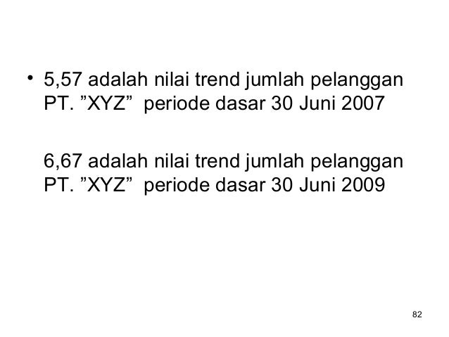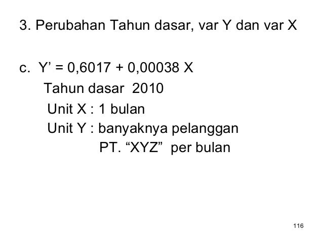 - 116. 116 3. Perubahan Tahun dasar, var Y dan var X c. Y’ = 0,6017 + 0,00038 X Tahun dasar 2010 Unit X : 1 bulan Unit Y : banyaknya pelanggan PT. “XYZ” per bulan