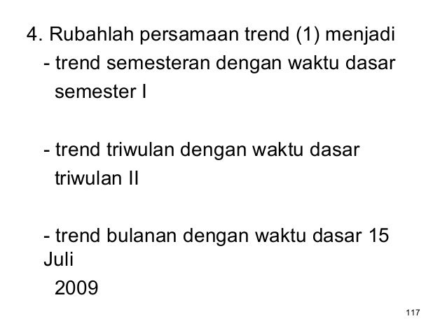 - 117. 4. Rubahlah persamaan trend (1) menjadi - trend semesteran dengan waktu dasar semester I - trend triwulan dengan waktu dasar triwulan II - trend bulanan dengan waktu dasar 15 Juli 2009 117