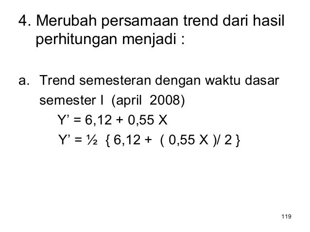 - 120. 120 4. Merubah persamaan trend dari hasil perhitungan menjadi : a. Trend semesteran dengan waktu dasar semester I (april 2008) Y’ = 6,12 + 0,55 X Y’ = ½ { 6,12 + ( 0,55 X )/ 2 } = 3,06 + 0,1375 ( – 0,5 ) + 0,1375 X = 2,99125 + 0,1375 X
