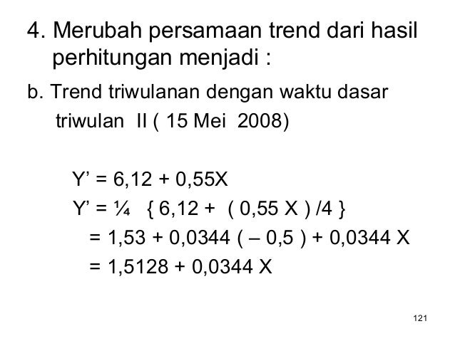 - 121. 121 4. Merubah persamaan trend dari hasil perhitungan menjadi : b. Trend triwulanan dengan waktu dasar triwulan II ( 15 Mei 2008) Y’ = 6,12 + 0,55X Y’ = ¼ { 6,12 + ( 0,55 X ) /4 } = 1,53 + 0,0344 ( – 0,5 ) + 0,0344 X = 1,5128 + 0,0344 X
