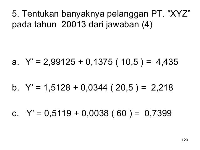 - 123. 123 5. Tentukan banyaknya pelanggan PT. “XYZ” pada tahun 20013 dari jawaban (4) a. Y’ = 2,99125 + 0,1375 ( 10,5 ) = 4,435 b. Y’ = 1,5128 + 0,0344 ( 20,5 ) = 2,218 c. Y’ = 0,5119 + 0,0038 ( 60 ) = 0,7399