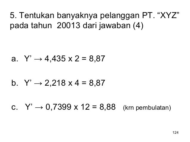 - 124. 124 5. Tentukan banyaknya pelanggan PT. “XYZ” pada tahun 20013 dari jawaban (4) a. Y’ → 4,435 x 2 = 8,87 b. Y’ → 2,218 x 4 = 8,87 c. Y’ → 0,7399 x 12 = 8,88 (krn pembulatan)
