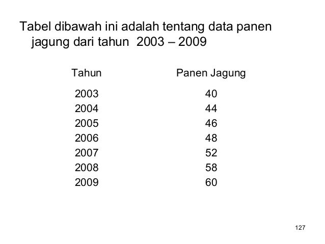 - 127. 127 Tabel dibawah ini adalah tentang data panen jagung dari tahun 2003 – 2009 Tahun Panen Jagung 2003 2004 2005 2006 2007 2008 2009 40 44 46 48 52 58 60