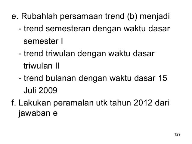 - 129. 129 e. Rubahlah persamaan trend (b) menjadi - trend semesteran dengan waktu dasar semester I - trend triwulan dengan waktu dasar triwulan II - trend bulanan dengan waktu dasar 15 Juli 2009 f. Lakukan peramalan utk tahun 2012 dari jawaban e