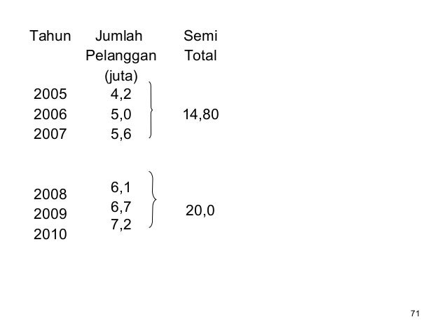 - 97. 97 a. Untuk data ganjil Tahun Jumlah Pelanngan (dalam juta) 2006 2007 2008 2009 2010 5,0 5,6 6,1 6,7 7,2 Jumlah 30,6