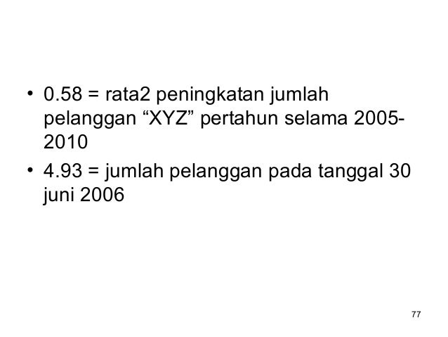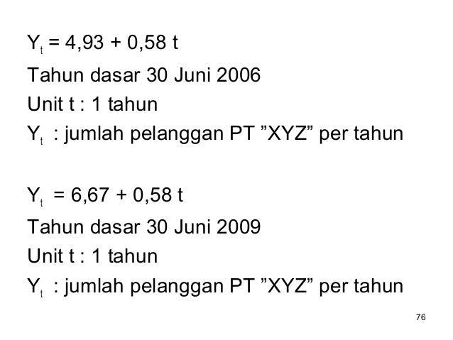 - 101. 101 12,6 5 65,30 === ∑ n Y a 55,0 10 5,5 2 === ∑ ∑ X XY b Y’ = 6,12 + 0,55 t Tahun dasar 2008 Unit t 1 tahun ; Y jumlah pelanggan dlm juta