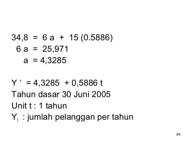 - 94. 94 34,8 = 6 a + 15 (0.5886) 6 a = 25,971 a = 4,3285 Y ‘ = 4,3285 + 0,5886 t Tahun dasar 30 Juni 2005 Unit t : 1 tahun Yt : jumlah pelanggan per tahun